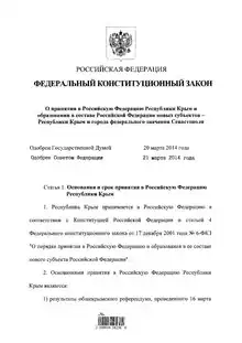 La anexión de Crimea por Rusia se refiere a la anexión unilateral no reconocida internacionalmente por parte de la Federación de Rusia de las dos entidades que forman la península de Crimea, la República de Crimea y la ciudad autónoma de Sebastopol, y que formaban parte de la República de Ucrania desde la disolución de la Unión Soviética en 1991. Las dos entidades fueron declaradas como sujetos federales de la Federación de Rusia,[16] de acuerdo con la Ley sobre Nuevos Territorios Federales de la legislación rusa que se aplicó en la península. Esa legislación considera a Crimea parte de Rusia desde el momento de la firma del acuerdo interestatal del 18 de marzo de 2014 y el periodo transitorio se prolongó hasta el 1 de enero de 2015.[17]