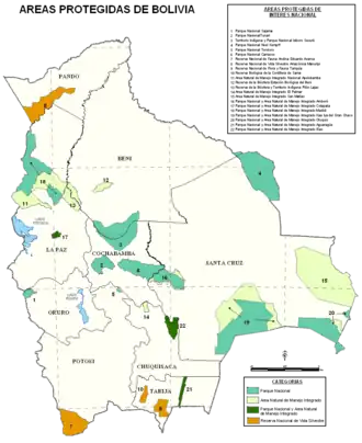 Dentro el territorio boliviano las categorías que existen actualmente en la legislación boliviana son: Parque nacional, Monumento Natural, Reservas de Vida Silvestre, Santuario Nacional, Área Natural de Manejo Integrado y Reserva Natural de Inmovilización.