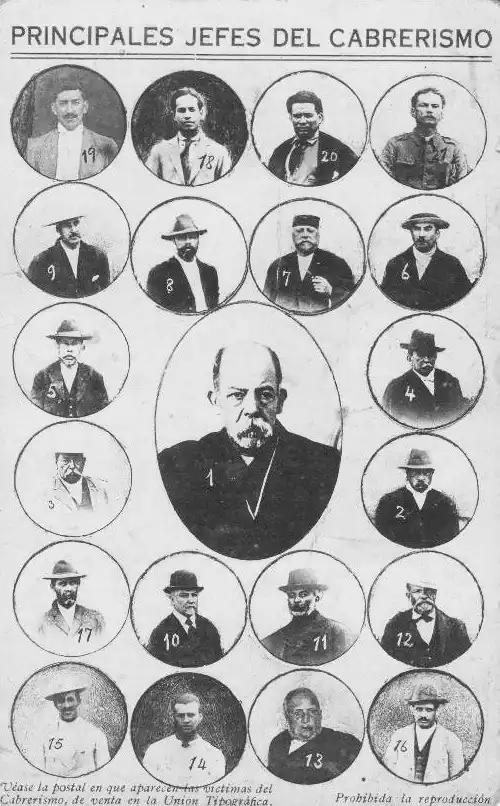| 6 | Máximo Soto Hall | Poeta, político e ideólogo del cabrerismo que alabó al presidente hasta el final. Al momento de la caída del presidente se encontraba en Washington D. C., y no regresó a Guatemala hasta 1926.[2] |