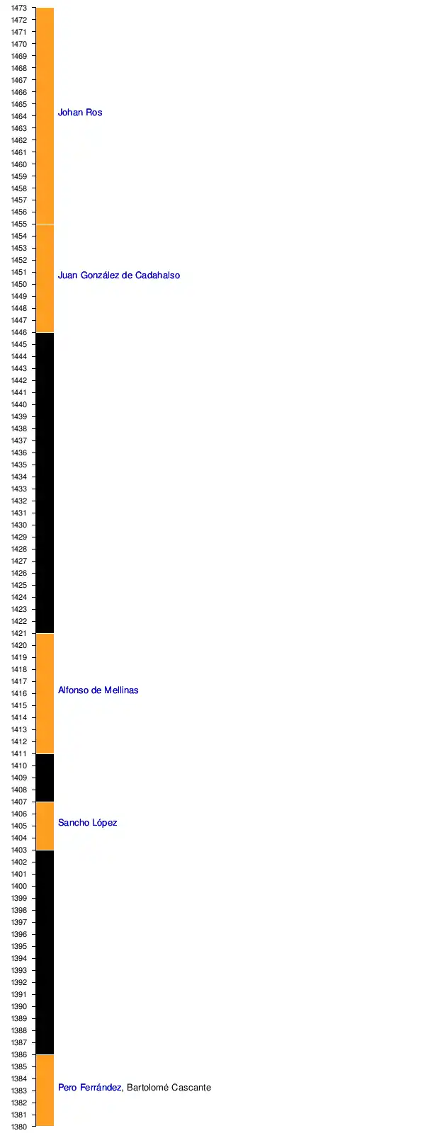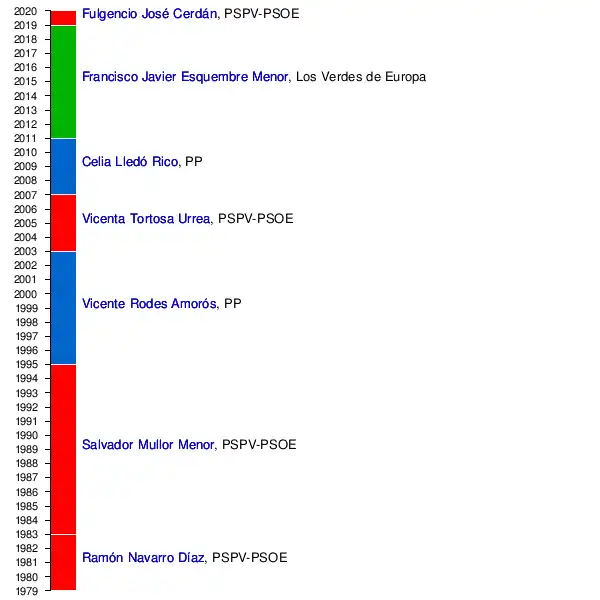 Alcaldes de Villena de 1900 a 1978. De 1900 a 1931 en naranja los designados por decreto y en naranja claro los elegidos por votación. Entre 1931 y 1939 en lila los republicanos de izquierdas y en lila claro los de derechas. A partir de 1939, los designados por decreto en azul:[1]
