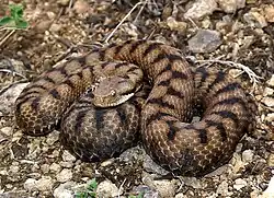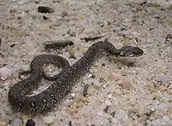 Lc: 50 (70) cm. Parte posterior de la cabeza ancha y hocico triangular terminado en una prominencia hacia arriba. Cola corta. Su color varía del gris al pardo y tiene una banda en zigzag que recorre la espalda. |
