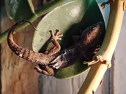 | Tarentola mauritanica*[41] | Salamanquesa común | L: 5-7 cm. C: 5-8 cm. El lomo, las patas y la cola tienen bultos cónicos prominentes. Cabeza grande y ancha, triangular y con ojos grandes con pupila vertical sin párpados. Su coloración puede variar del pardo al gris oscuro, con manchas; el vientre es blanquecino. Tiene cinco dedos en cada pata, con protuberancias laminares laterales e inferiores que le proporcionan cierta adherencia para trepar y desplazarse por superficies verticales. |