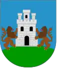 En campo de azur, una torre de oro sumada de un brazo armado de plata con una espada desnuda en su mano del mismo metal; cortado de oro, un lobo pasante de sable.[1] |