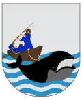 En campo de plata, un barco ballenero alterado sobre ondas de mar de azur y plata, en el que se ve a un marino que arponea una ballena de sable, también alterada, brochante sobre las ondas de agua.[1] |