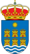 ![]() Escudo de azur. Sostenido por ondas de plata y azur, tres castillos de oro, almenados, mazonados de sable y aclarados de gules, puestos en faja y surmontados de otros tres castillos idénticos a los descritos, también en la misma situación de faja, surmontado, a su vez, el central de un sol radiante de oro. Al timbre, corona real. [19] Nota: El escudo que usa actualmente el ayuntamiento (derecha) es distinto al aprobado oficialmente. |