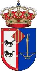 Escudo cortado. Primero de gules, las cinco veneras de plata. Segundo, de oro, los cuatro palos de gules. Al timbre corona real abierta.[44] |