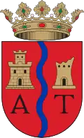 Escudo cuadrilongo de punta redonda. En campo de azur una torre de oro, mazonada y aclarada de sable, surmontada de un capelo con cordones y seis borlas de oro. Por timbre, corona real abierta.[42] |