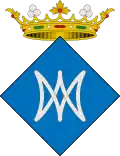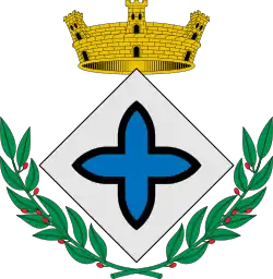 El escudo no ha sido normalizado ni oficializado por la Generalidad de Cataluña. El ayuntamiento del municipio utiliza el siguiente escudo: Cuartelado, con los cuatro palos del Casal de Barcelona (de gules) en campo de oro, en los cuarteles primero y cuarto, y cinco menguantes (ranvesadas) de plata en aspa, sobre campo de azur en los cuarteles segundo y tercero. Va timbrado con corona ducal.»[34] |