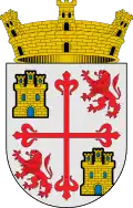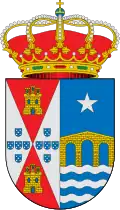 Escudo español, de gules, torre donjonada de oro; bordura de azur, con siete torres de oro. Al timbre, corona real abierta. [10] |