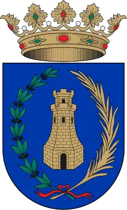 Escudo cuadrilongo de punta redonda. En el primer cuartel, en campo de gules, una torre de oro de planta redonda, cubierta con una cúpula del mismo metal, mazonada y aclarada de sable, acostada de dos ramas de laurel cruzadas de sinople, la siniestra frutada de sable. En el segundo cuartel, en campo de oro cuatro palos de gules, con bordura de plata, cargada con ocho escudetes de oro, con una faja de azur. Al timbre, corona real abierta.[32] |