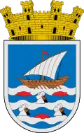 ![]() En campo de azur, sobre ondas de argén y azur, una fusta al natural con dieciseis remos de oro y vela triangular de plata, sobre las ondas, tres piratas en el agua, con turbantes en gules. Filiera de oro. Timbrado con la corona mural civil de ciudad, compuesta por un lienzo de muralla con diez puertas, cinco visibles, realzado de ocho torres almenadas, cinco visibles, unidas hasta la mitad de su altura por un muro sin almenas, con garitas de plata entre las torres.[13] [14] A la derecha, el escudo utilizado hasta la entrada en vigor de la resolución con la siguiente descripción: En campo de azur, barco de madera y velas triangulares de plata sobre ondas de plata y azur. Sobre estas ondas tres cabezas de moro mal ordenadas interpoladas por manchas de gules. Bordura estrecha de plata. Al timbre, corona mural. [15] |