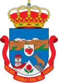 Escudo español, partido. Primero de oro, una rama con tres hojas de roble (Quercus pyrenaica) de sinople. Segundo de sinople, dos chimeneas unidas de plata con salidas de sable, entado en punta de azur, una sierra de plata con una cumbre saliente de la punta, surmontada de una estrella de las nieves (Plantago Nivalis) de plata, botonada de oro. Al timbre, corona real española cerrada.[36] |