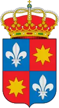 Escudo partido: 1.º de gules, un castillo de oro sobre un monte de oro; 2.º cuartelado en aspa; A) y D) de sinople, la banda de gules fileteada en oro; B) y C) de oro llano con las letras Ave María. Entado en punta de plata, ocho roeles de gules. Timbrado con la corona real española.[31] |