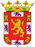A la derecha, el escudo en vigor hasta 1999 con la siguiente descripción, según el B.O.E.: En campo de gules, el león rampante de oro. Bordura con ocho compones, los cuatro de gules, el castillo de oro, y los otros cuatro de plata, el león rampante de gules (en realidad, de púrpura). Timbre, corona real abierta.[13] |