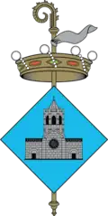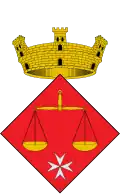 «De azur, dos llaves pasadas en aspa, con los dientes arriba y mirando hacia fuera, la de oro en banda sobre la de plata en barra, surmontadas en un bezante de oro cargado de un boj arrancado de sinople. Al timbre, corona de marqués.» Blasón aprobado el 1 de junio de 1983. DOGC n.º 342 de 6 de julio de 1983.[16] |
