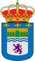 Escudo medio partido y cortado. 1º de gules, un castillo de plata mazonado de sable y aclarado de azur. 2º de plata, una gavilla de tres espigas de sinople. 3º de azur, un puente de plata de tres ojos puesto sobre ondas de plata y azur. Al timbre corona real española.[2] |