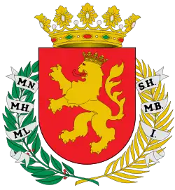 Escudo cuadrilongo de base circular. En campo de gules, una hoguera de lo mismo, flamante, de oro; bordura de azur, cargada en el centro del jefe de corona real abierta y de tres crecientes contornados, de plata, en los cantones del jefe y en el centro de la punta. Al timbre, Corona Real abierta.[20] |