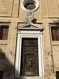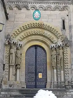 Porta di Adamo del Duomo di Bamberga con el escudo pontificio para indicar el estatus de una basílica menor.
