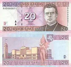 El billete muestra el retrato del poeta del romanticismo lituano Maironis, pseudónimo de Jonas Mačiulis (1862-1932), quien fue un gran patriota e hizo esfuerzos para levantar la nación, e inspiró la resistencia en contra de las políticas de rusificación y luchó por la independencia de Lituania contra la Rusia imperial.