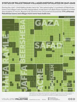 Durante la guerra de Palestina de 1947-1949, o la Nakba, alrededor de 500 ciudades y pueblos árabes palestinos fueron despoblados por la fuerza, y la mayoría fueron destruidos y quedaron inhabitables.[1][2] [3] Hoy en día, todos estos lugares se encuentran en Israel; muchos de ellos fueron repoblados por inmigrantes judíos, cuyos nombres fueron reemplazados por topónimos hebreos.
