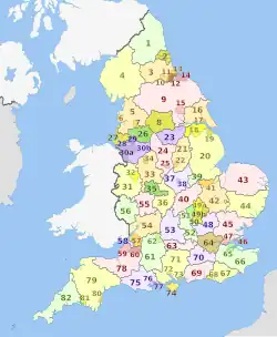 | 61 | 36 | 13 | Wiltshire | Sudoeste de Inglaterra | Autoridad unitaria | 3255 | 474 300 | 146 | Trowbridge | 32 304 |