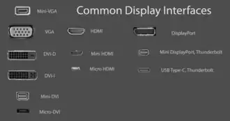 | VGA | 1987 | Conector VGA, entre las variantes se incluyen DE-15/HD-15 (canónico), DE-9, RGB o RGBHV en Conectores BNC separados, Mini-VGA, DVI/Conector Mini-DVI/Micro-DVI. | Analógico | 2048 × 1536 @ 85[nota 1] |