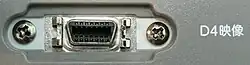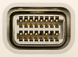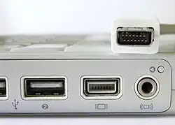 ![]() El conector Mini-VGA Macho en la parte superior de una computadora portátil de Apple, el puerto hembra es segundo de la derecha. |