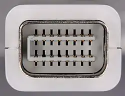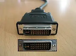 Conector VGA (DE-15 es la variante común.) | Casi se convirtió en el conector de la pantalla de computadora analógico omnipresente después de haber sido introducido con las máquinas IBM x86. Los conectores VGA antiguos fueron DE-9 (9 pines). El moderno conector DE-15 puede transportar Display Data Channel para que el monitor se comunique con la tarjeta gráfica, y opcionalmente viceversa.[6] | Siendo reemplazado por DVI a partir de 1999.[cita requerida] |