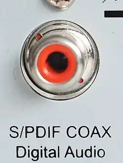 | Conector de RF (señales análogas de radio frecuencia). En general usa tipos de cable coaxial como RG-6 y RG-59 (a excepción de conductores gemelos). | |||