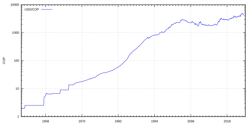 Tasa de cambio del peso colombiano frente al dólar desde 1950 en escala logarítmica.[1]