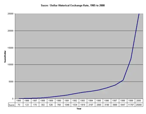 En el gráfico se evidencia la curva ascendente del precio del sucre frente al dólar, originado por una fuerte crisis financiera que causó la extinción de la divisa ecuatoriana.[7]