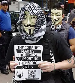 Varios contingentes de Anonymous han dado apoyo al movimiento Occupy Wall Street, con miembros que asisten a las protestas locales y a los blogs dirigidos por miembros que cubren el movimiento el movimiento.[182][183][184]