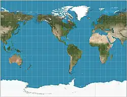 - Cilíndrica: en la presentación habitual, representa los meridianos espaciados regularmente en igualmente espaciadas líneas verticales, y los paralelos en líneas horizontales.
