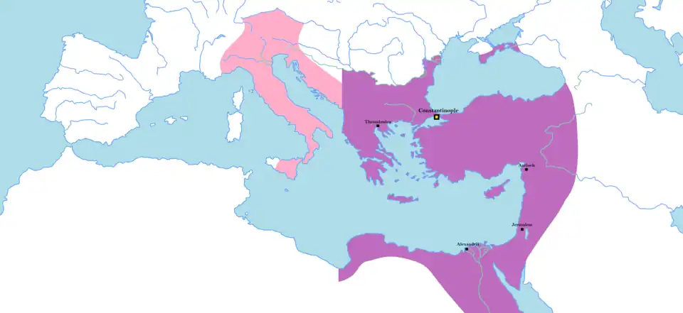 El Imperio bizantino es el nombre con el que se conoce a la mitad oriental del Imperio romano que nació de su división a la muerte de Teodosio I en el 395. Fue conocido por sus contemporáneos simple y llanamente como el Imperio romano (griego: Basileía Rhōmaíōn); el término «bizantino» fue creado por el alemán Hieronymus Wolf en el siglo XVI y proviene de Bizancio, el antiguo nombre de la capital imperial (Constantinopla).