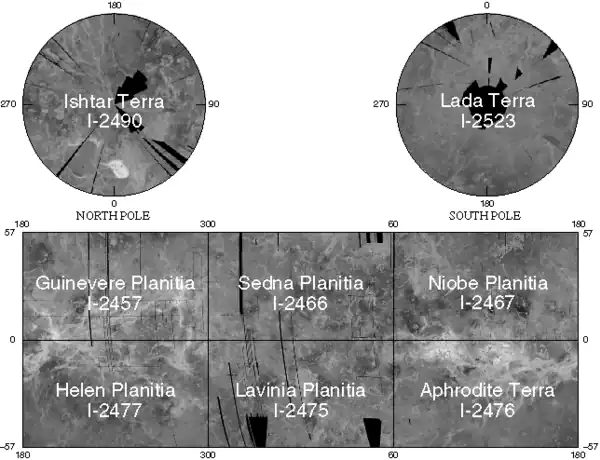 La superficie de Venus se ha dividido en un mapa de 8 cuadrángulos a escala 1:10.000.000,[1] o a un mapa de 62 cuadrángulos a escala 1:5.000.000.[2]