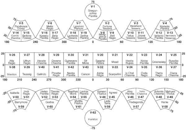 Los cuadrángulos del mapa 1:10,000,000 de Venus