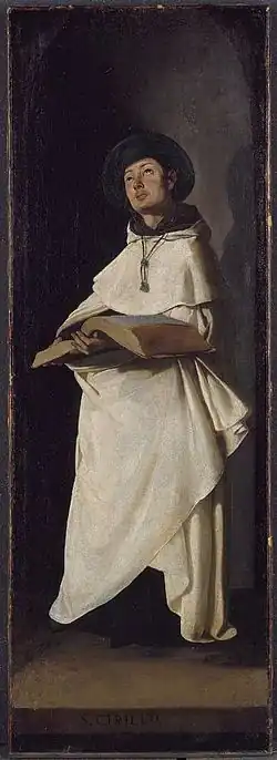 Beato Cirilo | 1633-1635 ca. , según Delenda (después de 1634 , según el Museo) | 91 × 32 cm , según Delenda (92.4 x 32.4 cm , según el Museo) | Museo de Bellas Artes (Boston) , Invent.: 22.642[28] | Iglesia de San Alberto (Sevilla) | 70 |