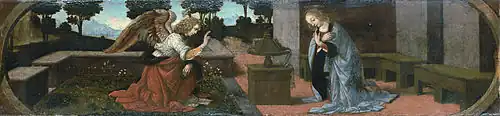 | Anunciación | 1478 - 1480 | Temple y óleo sobre tabla | 16 × 60 cm | Museo del Louvre, París | Algunos críticos proponen atribuirla a Lorenzo di Credi, pero partiendo este para su realización de un dibujo previo de Leonardo. Apoya esta proposición la existencia de un dibujo atribuido a Leonardo con el mismo esquema general y que se conserva en la Galería Uffizi. | |