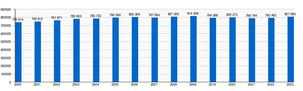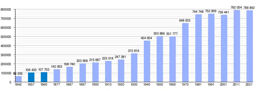 | Población | 103 918 | 137 960 | 165 466 | 192 569 | 213 550 | 233 348 | 251 258 | 320 195 | 450 756 | 509 075 | 505 066 | 653 690 | 751 734 | 777 427 | 750 476 | 807 200 | 807 693 | ||