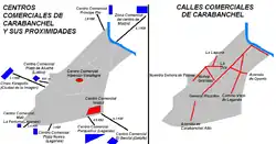 Mapa del comercio en Carabanchel. En el primer mapa se observa de rojo los centros comerciales de Carabanchel y de azul los centro comercial muy próximos a Carabanchel.