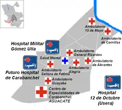Sistema sanitario en Carabanchel. En el nivel básico encontramos en cada barrio un ambulatorio, por encima de los ambulatorios esta el centro de especialidades de Carabanchel (Oftamología, traumatología, ginególogos Urologos.. etc) se encuentra en el ambulatorio de Aguacate . A nivel hospitalario, el actual hospital de referencia de Carabanchel es el 12 de octubre, en Usera, las urgencias también son atendidas por el Doce de Octubre