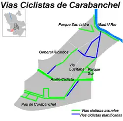 1.- Pista ciclista de Madrid Río: Esta pista ciclista se realizó tras las obras de la M-30, dentro del proyecto del Madrid Río. Hay una senda bici que se prolonga a lo largo del río y que llega por la parte Norte unos metros antes al Puente del Rey y por la parte Sur unos metros pasado el puente de Andalucía teniendo una longitud aproximada de 6.900 metros. En Carabanchel esta pista ciclistas pasa por la avenida del Manzanares, Marqués de Vadillo y la calle Antonio López. Por esta vía ciclista se pueden observar edificios emblemáticos de Madrid como el estadio Vicente Calderón, el Palacio Real de Madrid, la catedral de la Almudena, los rascacielos de Plaza de España, el Puente de Toledo y el puente de Segovia, entre otros.