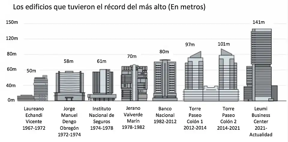 En 2014 se inauguran la Torre Paseo Colón (Torre 2), el primer rascacielos de más de 100 metros de altura de Costa Rica,[2][3] En 2021 se inauguró Leumi Business Center de 38 pisos y 141 metros de altura coronándose como el edificio más alto de Costa Rica y Centroamérica (sin contar a Panamá).[4]