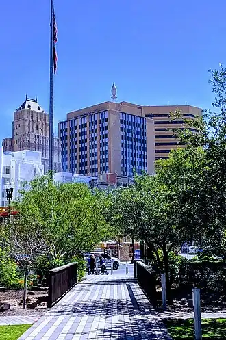 70 m | 17 | 1986 | El hotel original de 10 pisos abrió el 26 de noviembre de 1912, fue diseñado por Trost & Trost y tenía 46 m de altura.[13] La torre de 17 pisos adicional al hotel fue construida en 1986. El hotel se encuentra actualmente en una renovación importante de 70 millones de dólares con planes para reabrir en 2020 como The Hotel Paso del Norte, Autograph Collection by Marriot.[14][15] |