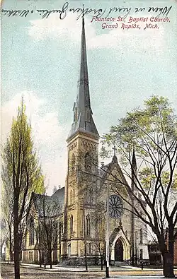 - ↑ Logie, Thomas R. Dilley ; foreword by John H. (2007). Grand Rapids in stereographs,1860-1900. Charleston, SC: Arcadia Pub. p. 63. ISBN 9780738551227. «The spire on the church was an amazing 217 feet in height, The entire building was destroyed in a catastrophic fire in 1917...»