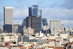 El parque empresarial Cuatro Torres Business Area (CTBA), conocido popularmente como «las cuatro torres», fue construido entre 2004 y 2009 sobre los terrenos de la antigua ciudad deportiva del Real Madrid, al final del paseo de la Castellana.[20] Actualmente contiene las cuatro torres más altas de Madrid y de España: la Torre de Cristal,[1] la Torre Cepsa,[2] la Torre PwC,[3] y la Torre Espacio,[4] que además se encuentran entre los diez edificios más altos de la Unión Europea. Junto a ellas se encuentra Caleido, un rascacielos de 36 plantas y 181 metros de altura (algo inferior a sus torres vecinas), conocido popularmente como «la quinta torre», que fue completado en 2021 y actualmente es el quinto rascacielos más alto de Madrid y el séptimo de España.