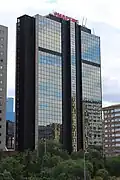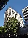 Proyecto más conocido del arquitecto Antonio Lamela.[43] Sobre la base o podio se alzan dos torres gemelas de color marrón anaranjado coronadas por dos copetes verdosos unidos por un remate con forma de enchufe del que cuelgan las escaleras de emergencia. Por diversos motivos las plantas fueron construidas en sentido inverso, es decir, «de arriba para abajo».[44][45] En 2020 se inició una remodelación integral del edificio, que comprendía la desmantelación de la estructura de la cima conocida popularmente como «enchufe». Las obras concluyeron en junio de 2024.[46] |