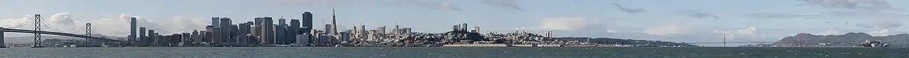 Muchos de los edificios más altos de San Francisco, particularmente los rascacielos de oficinas,[4]​ fueron completados en un gran boom de construcción de edificios que se extendió desde finales de la década de 1960 hasta finales de la de 1980.[5]​ Este boom fue apodado "ola de Manhattanización" por los habitantes de la ciudad, conduciendo a la legislación local a establecer algunos de los requisitos de límite de altura más estrictos del país.[6]​ Esto condujo a una reducción en la construcción de rascacielos durante los años 1990, pero la construcción de edificios más altos ha sido continuada recientemente, al relajarse y pasarse por alto los requisitos en la altura de los edificios a la luz de la reciente actividad económica. La ciudad está atravesando actualmente un segundo boom, con 34 edificios de más de 122 m de altura propuestos , aprobados o en construcción en la ciudad. San Francisco alberga 21 rascacielos con una altura superior a 150 m. En conjunto, el skyline de San Francisco está clasificado (según edificios construidos y en construcción de más de 150 m de altura) segundo en la Costa Oeste de Estados Unidos (tras Los Ángeles) y séptimo en Estados Unidos, después de Nueva York, Chicago, Miami, Los Ángeles, Houston y Dallas.[n. 1]