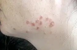 Vista de cerca de un párpado adulto en el que hay numerosas lesiones cutáneas pequeñas y elevadas llenas de material blanco