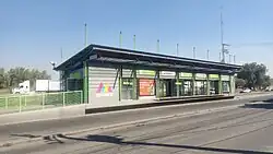 | Hospital (Hospital las Américas) | TR1, TR2, TR3 y TR4 | 1.º de Mayo | Aquiles Serdán | 2 de octubre de 2010 | Se ubica en Av. Central, toma su nombre de su cercanía con el hospital que se encuentra en el fraccionamiento Las Américas al oriente de la estación. Su símbolo representa una cruz, símbolo de los hospitales, con una H en el centro. | Línea 2A del Mexibús |